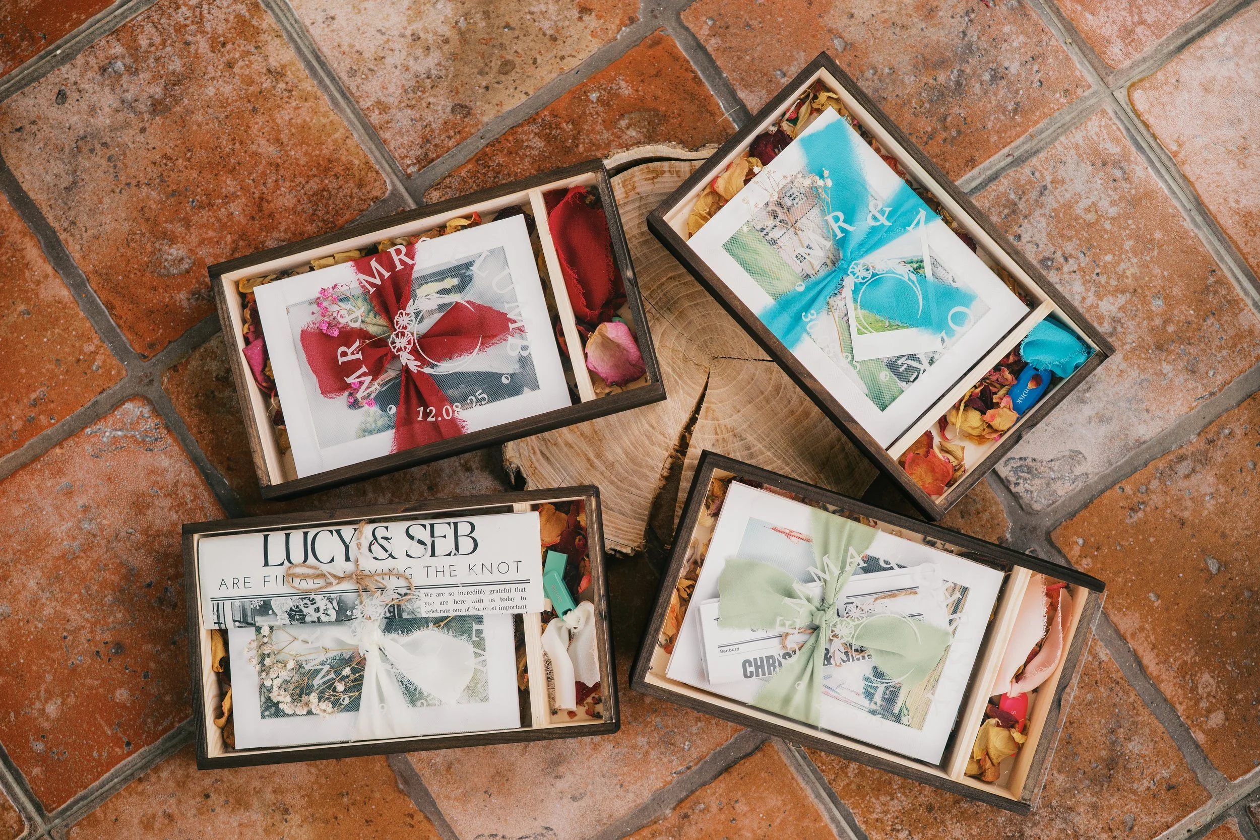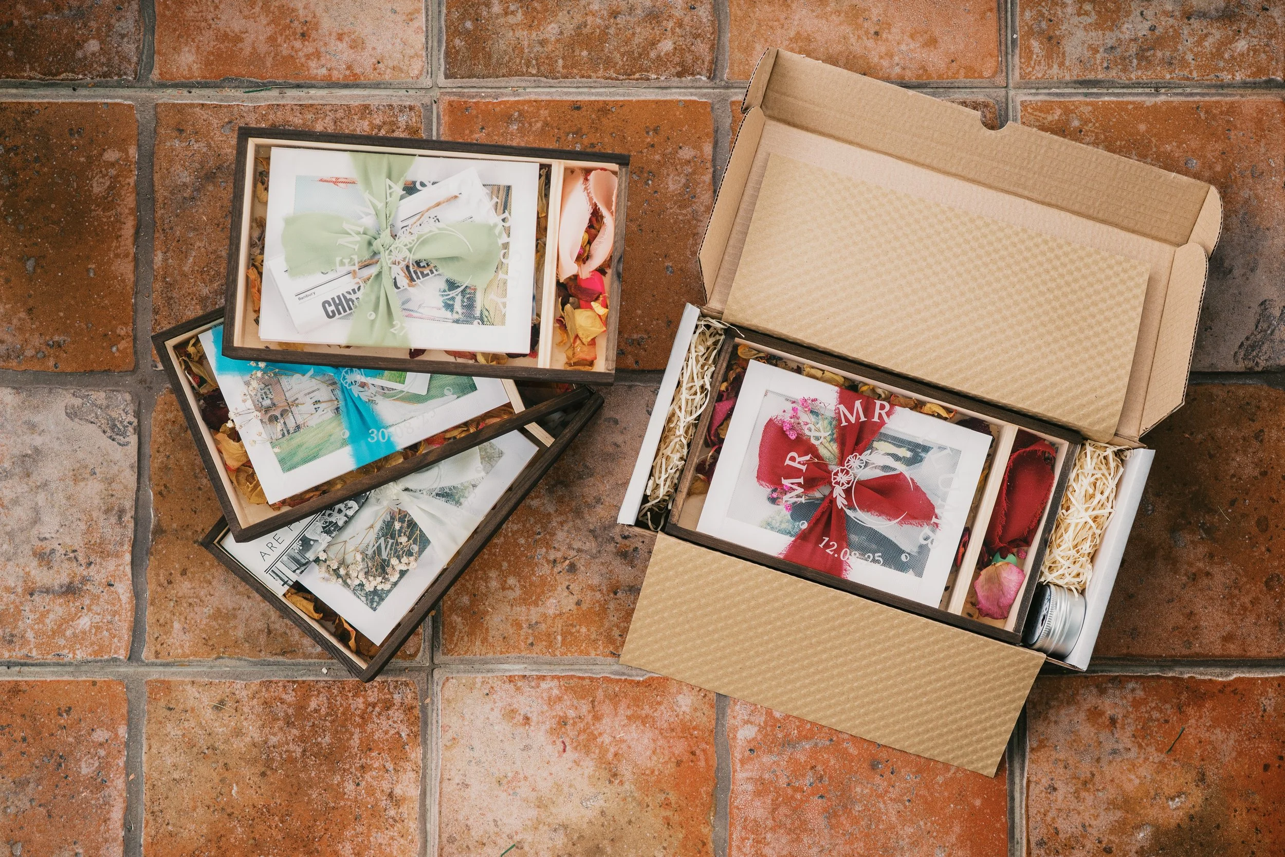 I also try to add some βsouvenirsβ from your wedding day, if I can, such as a bag of confetti, polaroid etc.